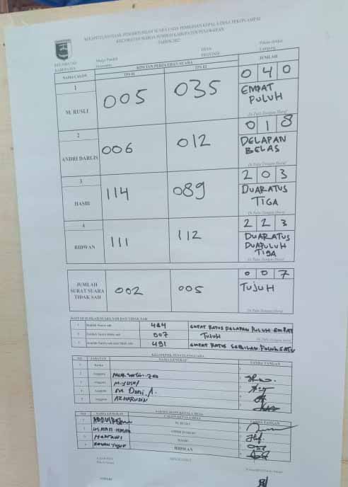 No urut 2.Andri Darlis 18 suara dan No Urut 3 Hasbi dengan perolehan suara 203.dari totol pemilih 491mata pilih.