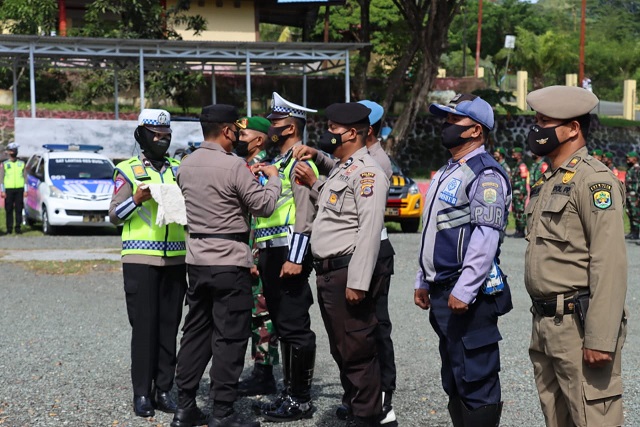 Kapolres Buol sebagai pimpinan apel pada kesempatan ini melakukan pemeriksaan pasukan apel serta penyamatan pita tanda operasi kepada perwakilan masing-masing dari Personel TNI, Sat Lantas, Sat Samapta, Satpol PP serta Dishub.