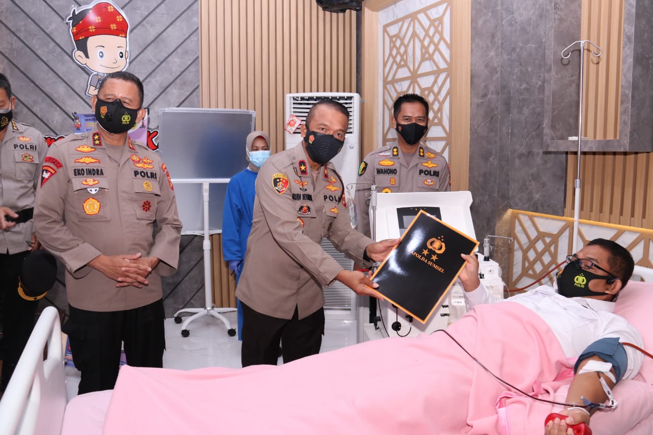 SuaraMabes, Palembang – Kapolda Sumsel Irjend Pol Prof Dr Eko Indra Heri S, MM, didampingi Wakapolda Sumsel Brigjen Rudi Setiawan Sik SH MH menyambangi gelar acara donor darah di RS Bhayangkara Moh Hasan Palembang.