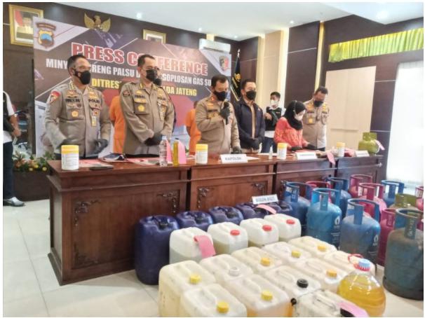 MediaSuaraMabes, Semarang – Direktorat Reserse Kriminal Khusus Polda Jateng mengamankan MNK (39) dan AA (51), keduanya diamankan lantaran menjual minyak goreng palsu yang ternyata hanya air berwarna kuning. Bahkan tersangka menggunakan air bekas cucian mobil sebagai bahan dasarnya. Tersangka menawarkan minyak goreng palsu tersebut kepada para korbannya dengan harga Rp 16.500 per liter di Kabupaten Kudus.