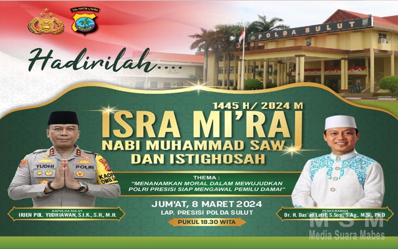 MediaSuaraMabes, Sulut – Polda Sulawesi Utara akan menggelar peringatan Isra Mikraj Nabi Muhammad SAW 1445 H dan Istighosah, di Halaman Presisi Polda Sulut, pada hari Jumat, 8 Maret 2024 pukul 18.30 Wita.
