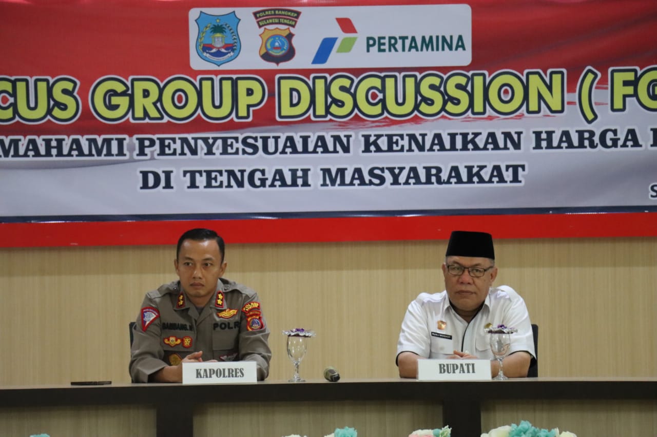 Kapolres Bangkep AKBP Bambang Herkamto, S.H., membuka langsung Focus Group Discussion (FGD) tersebut dan menyampaikan bahwa latar belakang dilaksanakannya FGD ini adalah adanya kebijakan pemerintah dalam penyesuaian harga BBM subsidi, sehingga kami perlu melaksanakan FGD dengan unsur terkait, kita akan mencari solusi dan memberikan pemahaman kepada peserta.