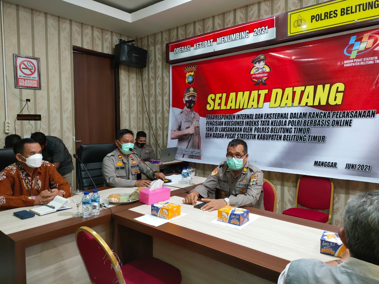 MediaSuaraMabes, Babel – Polres Belitung Timur bersama dengan BPS (Badan Pusat Statistik) melaksanakan survei tata kelola Polres Belitung Timur. Adapun survei ini bertujuan untuk mendorong perbaikan kinerja pada Kepolisian Negara Republik Indonesia khususnya Polres Belitung Timur, untuk itulah menggandeng BPS melakukan penilaian tata kelola di seluruh Polres di Indonesia.