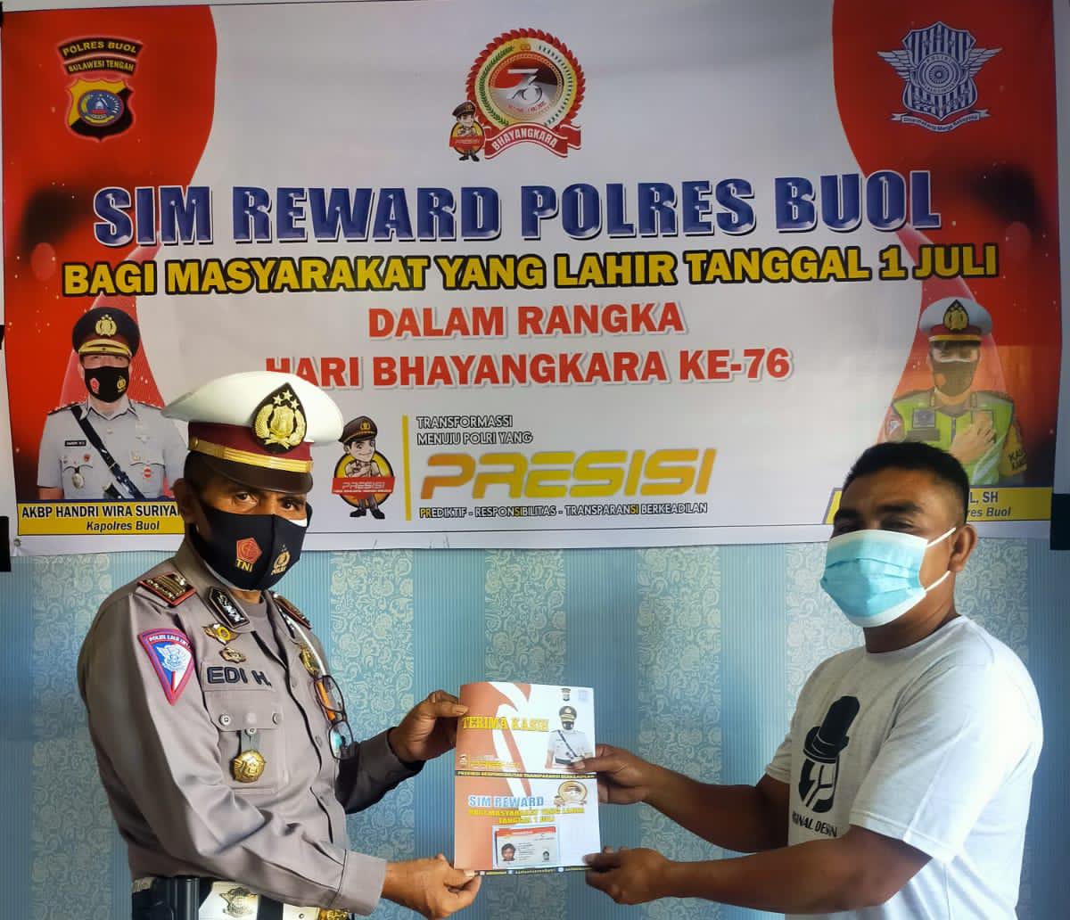 MediaSuaraMabes, Buol – Kepolisian Daerah Sulawesi Tengah Resor Buol, Polres Buol melalui Satuan Lalulintas memberikan SIM Gratis bagi warga yang lahir pada tanggal 1 Juli, Jum’at (01/07/22)