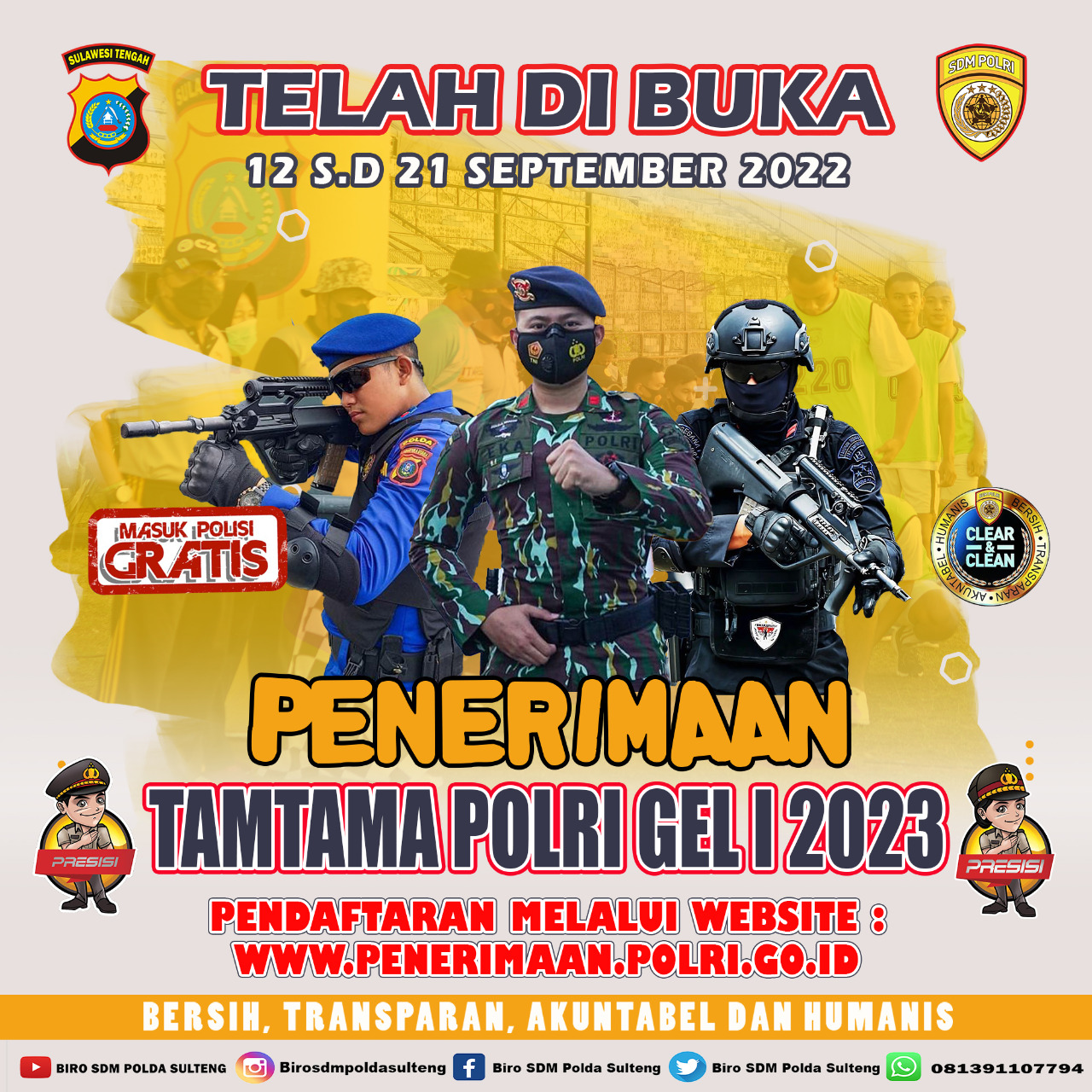 Penerimaan ini sesuai dengan Pengumuman Kapolda Sulteng Nomor : Peng/17/IX/DIK.2 1/2022 tanggal 09 September 2022 atas dasar putusan Kepala Kepolisian Negara Republik Indonesia Nomor : Kep/1166/VIII/2022 tanggal 31 Agustus 2002 tentang penerimaan Tamtama Polri.