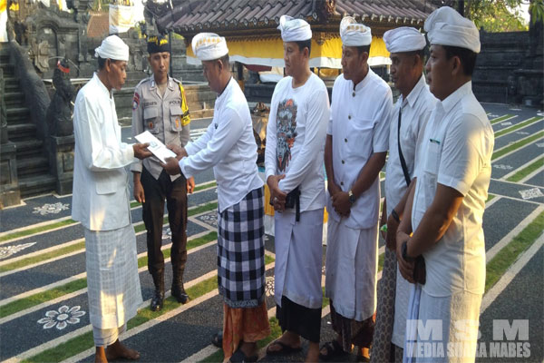 Setelah melaksanakan persembahyangan dilanjutkan dengan menyerahkan punia dari Kabag Ops Polres Jembrana Kompol Ida Bagus Putu Mertayasa,S.Ag kepada pemangku di Pura Dangkahyangan Indra Kusuma.