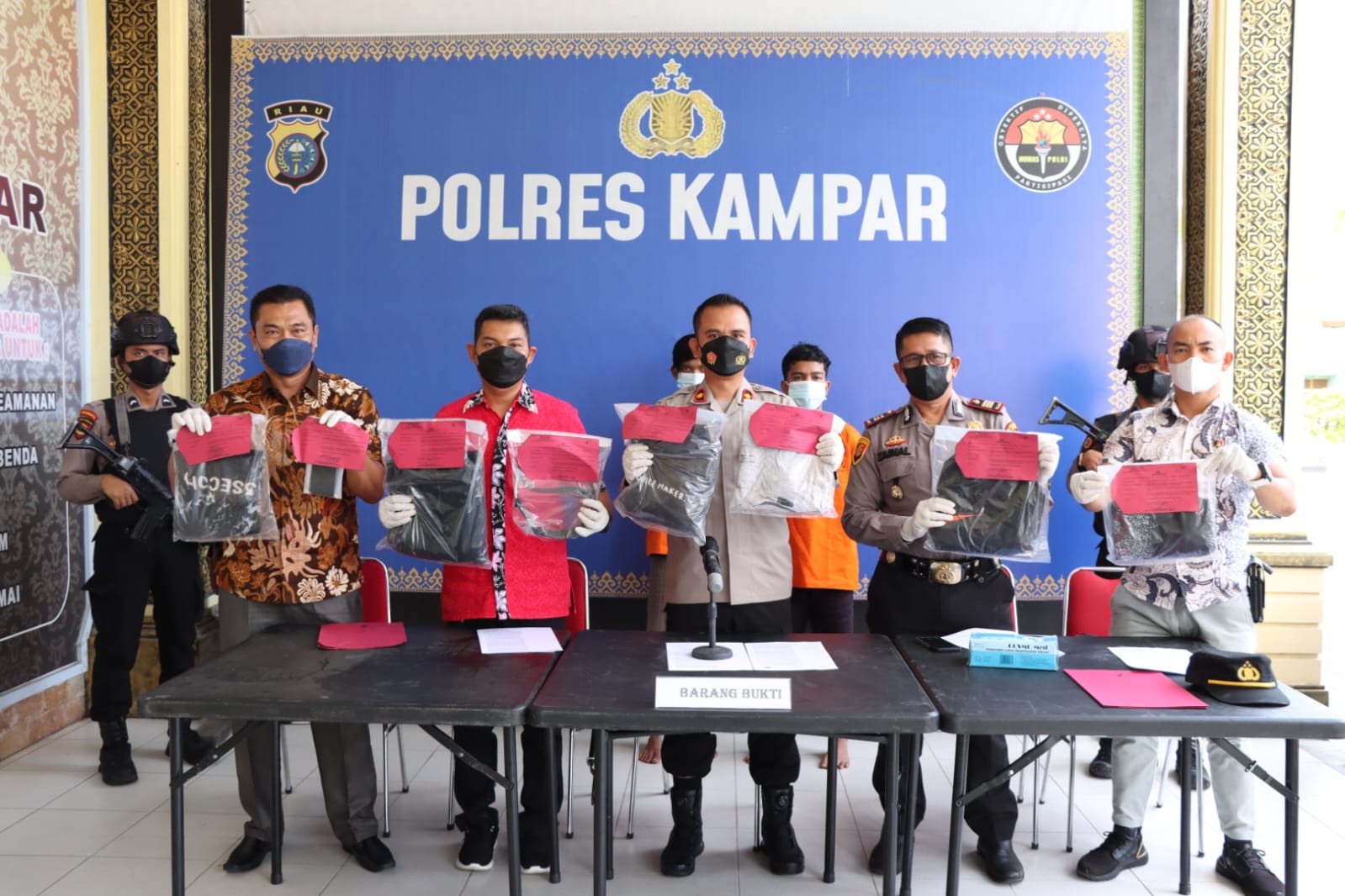 MediaSuaraMabes, Kampar – Polres Kampar gelar konferensi Pers ungkap kasus pembunuhan terkait penemuan mayat di jalan PT. HK/ Jalan Persawahan dusun 1 RT 004 RW 001, desa Baru kecamatan Siak Hulu, kabupaten Kampar, Jumat, (9/9/22) sekira pukul 10.00 WIB, di teras depan Mapolres Kampar.