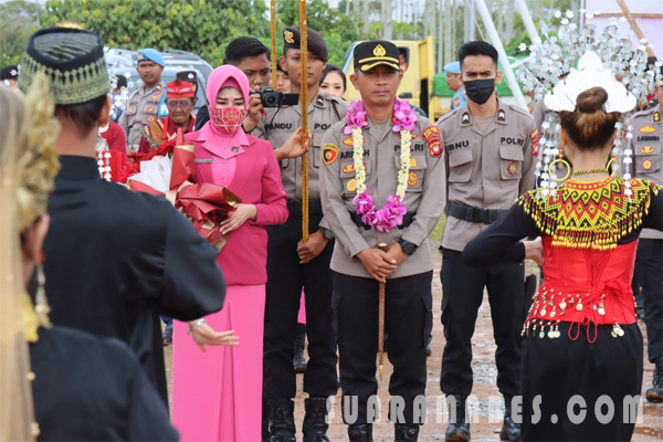Upacara penyambutan Kapolres Kubu Raya yang baru ditandai dengan pengalungan karangan bunga oleh AKBP Jerrold H.Y Kumontoy, selanjutnya diteruskan dengan adat tepung tawar dan disambut dengan tarian adat melayu dan dayak di pintu masuk menuju Mapolres Kubu Raya Jalan Alianyang Desa Durian Kecamatan Sungai Ambawang Kabuaten Kubu Raya, Kamis (5/1/23) pagi.