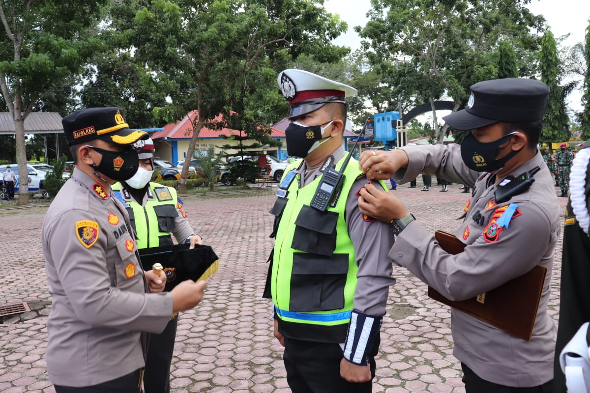 Apel juga ditandai penyematan pita oprasi kepolisian terpusat patuh toba 2021 kepada perwakilan petugas dari TNI, Polri dan Dinas Pergubungan.