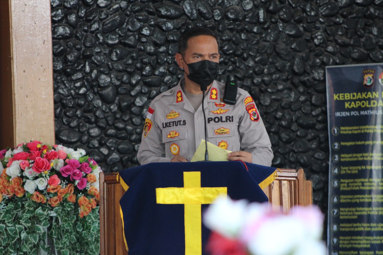MediaSuaraMabes, Nabire — Bertempat di P olres Nabire telah dilaksanakakan Ibadah Syukuran dan Lepas Sambut Tahun 2021 / 2022 dengan tema “Cinta Kasih Kristus Yang Menggerakkan Persaudaraan” dan sub tema “Dengan Kasih Mari Kitorang Jaga Bersama Kamtibmas di Kabupaten Nabire”. Kamis, (13/01/2022) pagi.
