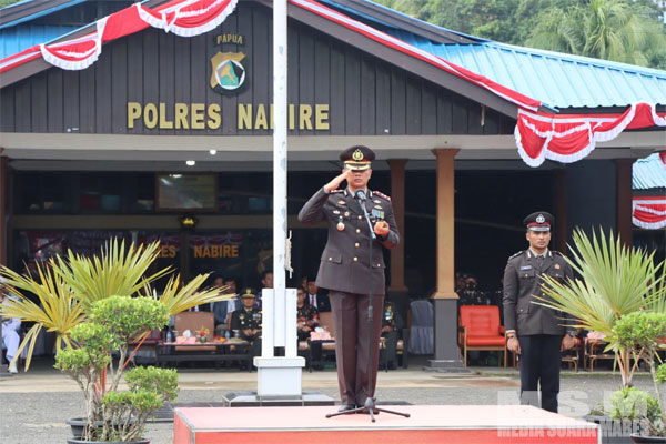 MediaSuaraMabes, Nabire ~ Bertempat di Lapangan Apel Polres Nabire dilaksanakan Upacara Peringatan hari Bhayangkara ke 77 tahun 2023 dengan tema Polri Presisi untuk Negeri, Pemilu Damai menuju Indonesia maju dengan Inspektur upacara Kapolres Nabire AKBP I Ketut Suarnaya, S.I.K., S.H.,Sabtu, (1/7/2023).