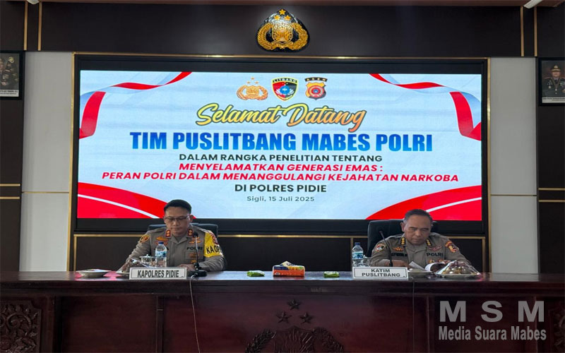 MediaSuaraMabes, Sigli – Polres Pidie menerima kunjungan Tim Peneliti dari Pusat Penelitian dan Pengembangan (Puslitbang) Mabes Polri dalam rangka kegiatan penelitian bertajuk “Menyelamatkan Generasi Emas: Peran Polri Dalam Menanggulangi Kejahatan Narkoba”, yang bertempat di Aula Wira Satya Polres Pidie, selasa (15/07/2025)