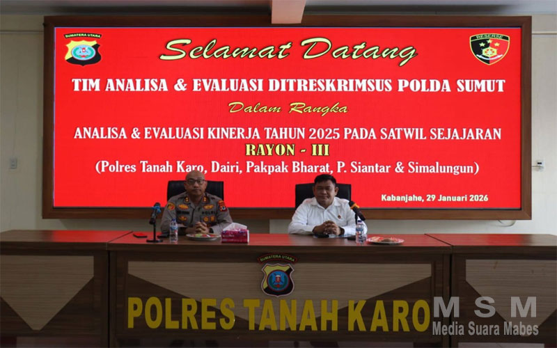MediaSuaraMabes, Karo — Polres Tanah Karo menerima kegiatan supervisi dari Direktorat Reserse Kriminal Khusus (Ditreskrimsus) Polda Sumatera Utara dalam rangka Analisa dan Evaluasi (Anev) kinerja Tahun 2025 untuk satuan wilayah jajaran Rayon 3. Kegiatan berlangsung di Aula Pur Pur Sage Mapolres Tanah Karo, Kamis (29/1/2026) sekitar pukul 10.00 WIB.