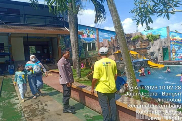 MediaSuaraMabes, Jepara – Bhabinkamtibmas Polsek Kembang Bripka Syarief melaksanakan Kegiatan Rutin Yang Ditingkatkan (KRYD) dengan cara patroli sasaran memantau situasi keamanan dan menyampaikan himbauan Kamtibmas kepada para pengunjung objek wisata Kolam Renang Andina Desa Jinggotan Kecamatan Kembang Kabupaten Jepara, Selasa (25/4/2023).