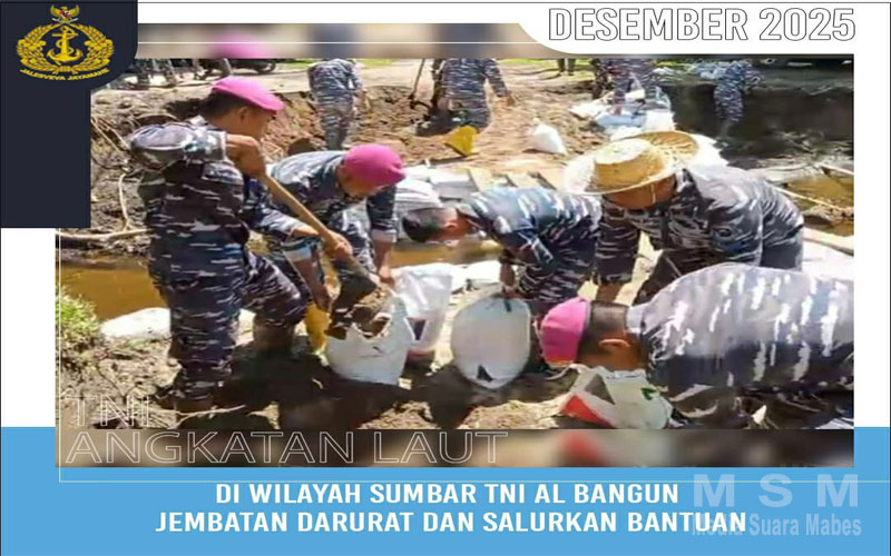 MediaSuaraMabes, Jakarta – Sebagai wujud kesiapsiagaan dalam penanggulangan bencana alam, puluhan prajurit dari Komando Daerah Angkatan Laut (Kodaeral) II Padang bergerak cepat mendirikan jembatan darurat serta mendistribusikan bantuan logistik bagi warga terdampak di Nagari V Jorong, Sumatera Barat, Selasa (9/12).