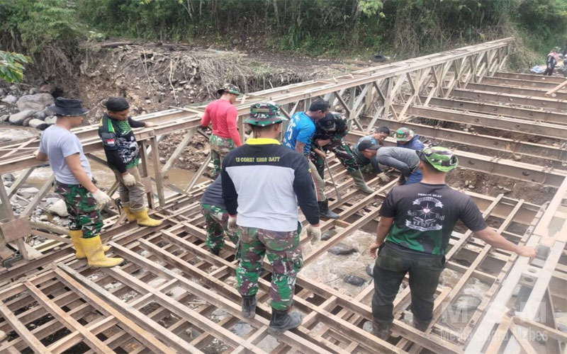 “Sebanyak 1 SST personel Prajurit Yonzikon 12/KJ Menzikon/CRK dengan asitensi dari Pusat Zeni Angkatan Darat (Pusziad) diturunkan untuk membangun jembatan Bailey sejumlah 9 petak type 2-1 guna akses penyaluran ke lokasi bantuan kemanusiaan tersebut, ” tutur Dandim.