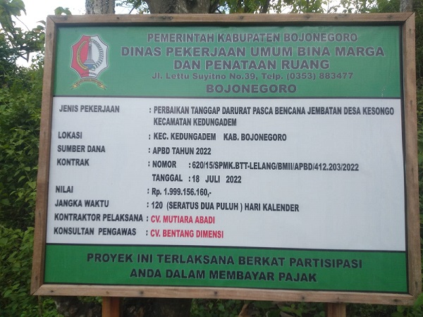 Sementara itu pada papan proyek yang ada dilokasi tertera anggaran pembangunan jembatan sebesar hampir 2 milyar rupiah untuk mendanai proyek.