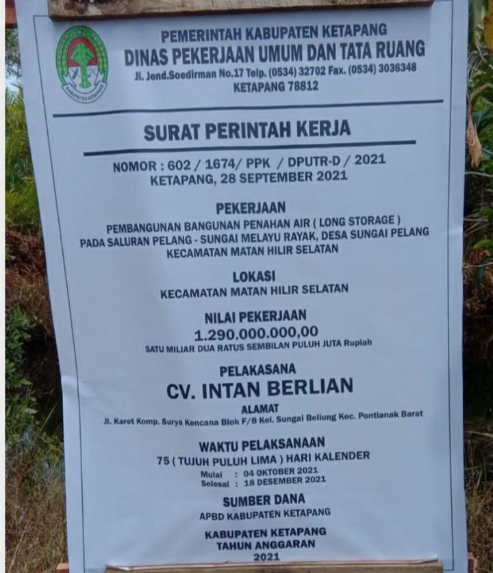 Proyek bangunan penahan air (long storage) diduga tidak selesai sesuai kontrak tanggal 18 Desember 2021. hal ini disampaikan LSM Peduli Kayong yang menilai ada persekongkolan antara dinas PUTR setempat dengan pihak kontraktor.