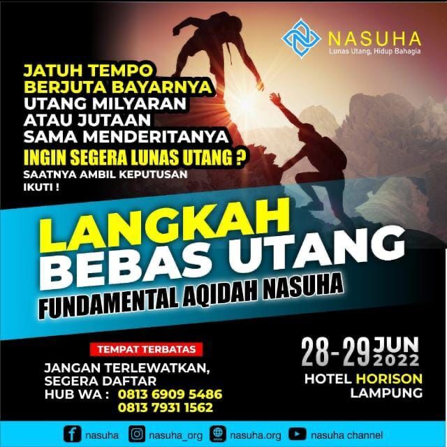 MediaSuaraMabes, Bandar Lampung – Komunitas Nasuha kembali menggelar acara spektakuler LANGKAH BEBAS UTANG. Acaranya digelar di Hotel Horison Jl. Kartini Bandar Lampung pada tanggal 28 – 29 Juni 2022.