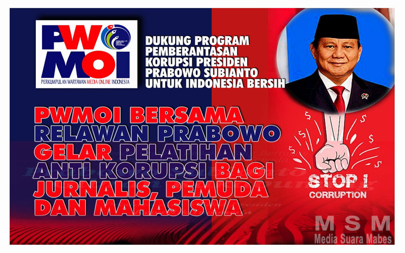 MediaSuaraMabes, Jakarta — PWMOI (Perkumpulan Wartawan Media Online Indonesia) gandeng Relawan Prabowo gelar pelatihan anti korupsi bagi jurnalis, pemuda dan mahasiswa guna mendukung komitmen Presiden Prabowo dalam memberantas korupsi di Bumi Nusantara
