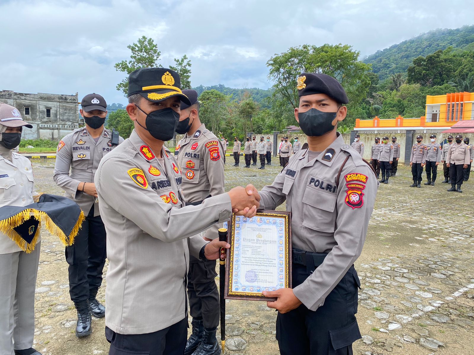 MediaSuaraMabes, Kapolres Kayong Utara AKBP Arief Hidayat, S.H., S.I.K memberikan penghargaan kepada personel Polres Kayong Utara yang berprestasi, dalam sebuah upacara di halaman Mapolres Kayong Utara, Senin (05/12/2022).
