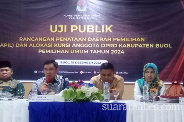 MediaSuaraMabes, Buol – KPU Kabupaten Buol menggelar Uji Publik Rancangan Penataan Pemilihan Dapil Dan Alokasi Kursi Anggota DPRD tahun 2024, Berdasarkan, Peraturan Komisi Pemilihan Umum(KPU) Nomor 6 tahun 2022, bertempat di hotel Surya wisata kamis [15/1/2022].