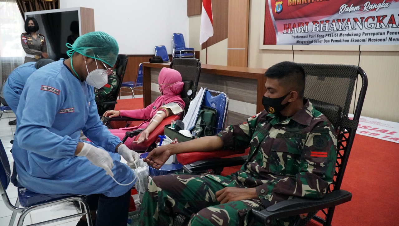 Tampak Kapolres Nunukan AKBP Syaiful Anwar,S.Ik bersama Istri selaku Ketua Bhayangkari Ny.Shelvi Widianingsih Syaiful, juga ikut dalam acara kegiatan donor darah ini yang merupakan rangkaian Peringatan Hari Bhayangkara ke 75.