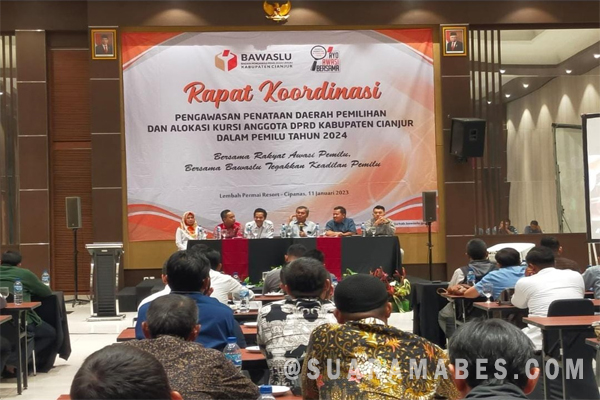 MediaSuaraMabes, Cianjur – Rapat koordinasi pengawasan penataan daerah pemilihan dan alokasi kursi untuk anggota DPRD Kab.Cianjur pada Pemilihan tahun 2024, dilaksakan di Aula Tulip 1 Hotel Lembah Permai Lestari Ds.Sindangjaya Kec.Cipanas Kab.Cianjur, Jawa Barat, Rabu (11/01/2023), pukul 09.30 WlB.
