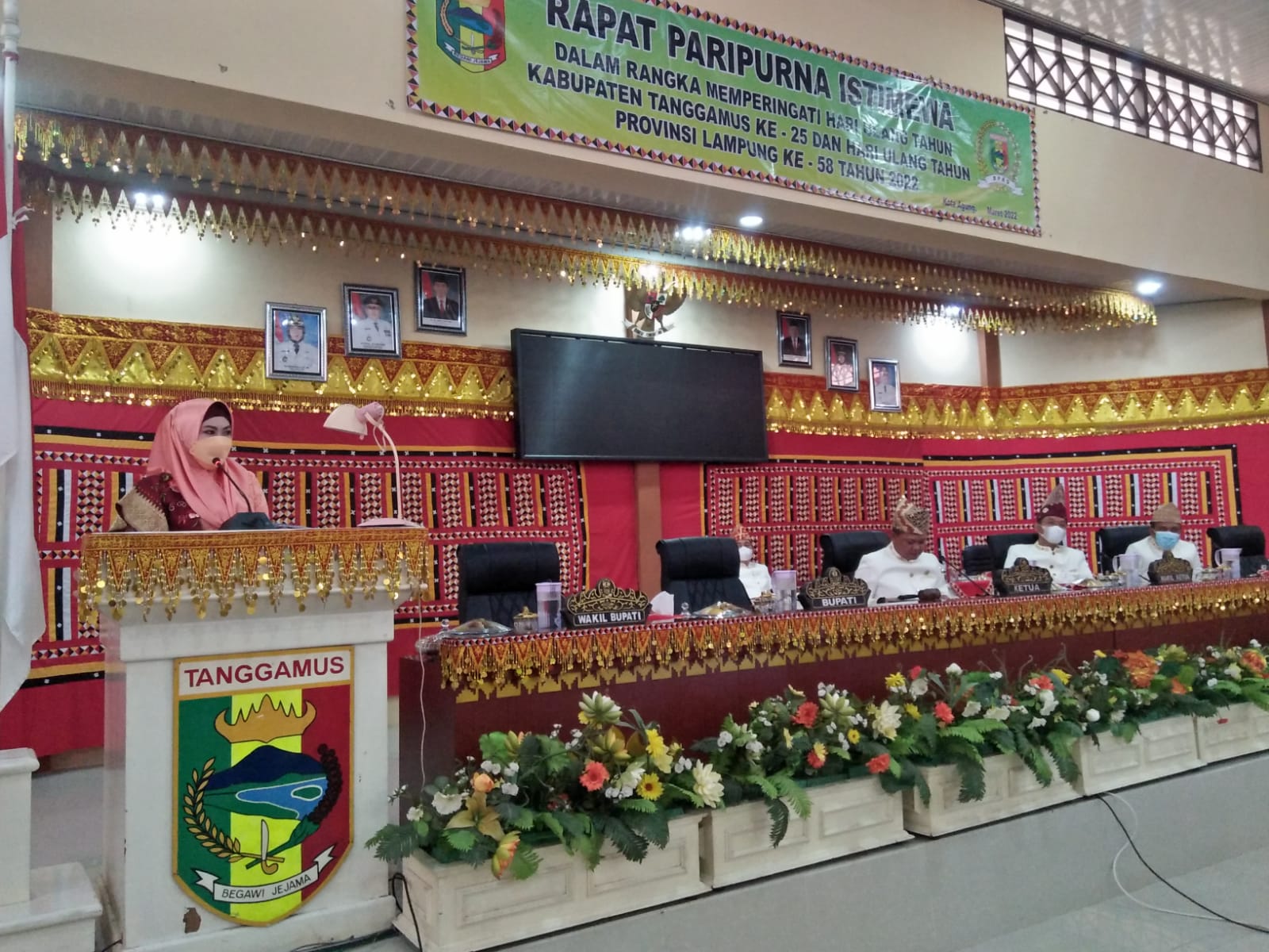 MediaSuaraMabes, Tanggamus – Bupati Tanggamus Hj. Dewi handajani SE. MM menghadiri Rapat Paripurna Dalam Rangka Menyambut Hari Ulang Tahun Kabupaten Tanggamus Yang Ke-25 Dan Hari Ulang Tahun Provinsi Lampung Ke-58 Tahun 2022 di Ruang sidang Sekretariat DPRD Kabupaten Tanggamus Jum’at (18/03/2022).