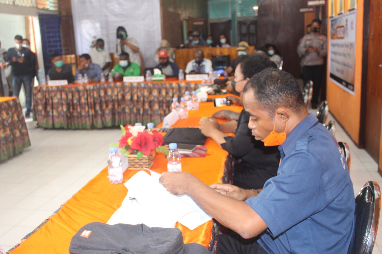 SuaraMabes, Nabire – Dalam Rangka Rapat Pleno Terbuka Rekapitulasi & Penetapan Daftar Pemilih Tetap DPT Pemungutan Suara Ulang (PSU) Pemilihan Bupati dan Wakil Nabire Tahun 2020, Kapolres Nabire AKBP Kariawan Barus, S.H., S.I.K., M.H menghadiri kegiatan tersebut, bertempat di Kantor KPU Nabire, Senin (21/06/2021).