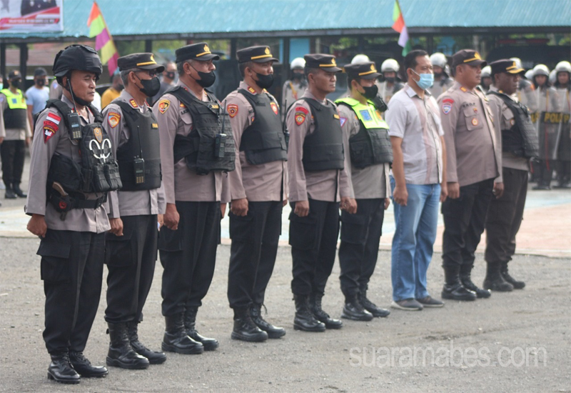 Setelah dilaksanakan apel pengecekan kesiapan pasukan dan perlengkapan, dilanjutkan simulasi pengamanan pengendalian massa di halaman Mapolres Nabire.