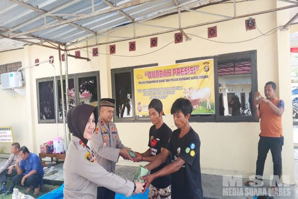 Kapolsek Prabumulih Barat IPTU Arafiq S.Ip dan Kapolsek RKT IPDA Santi Wijaya SH MH, pada Idul Adha hari kedua bertepatan dengan jumat yang penuh berkah, menyaksikan prosesi pemotongan dan secara langsung turut membagikan kantong daging qurban yang telah disiapkan.