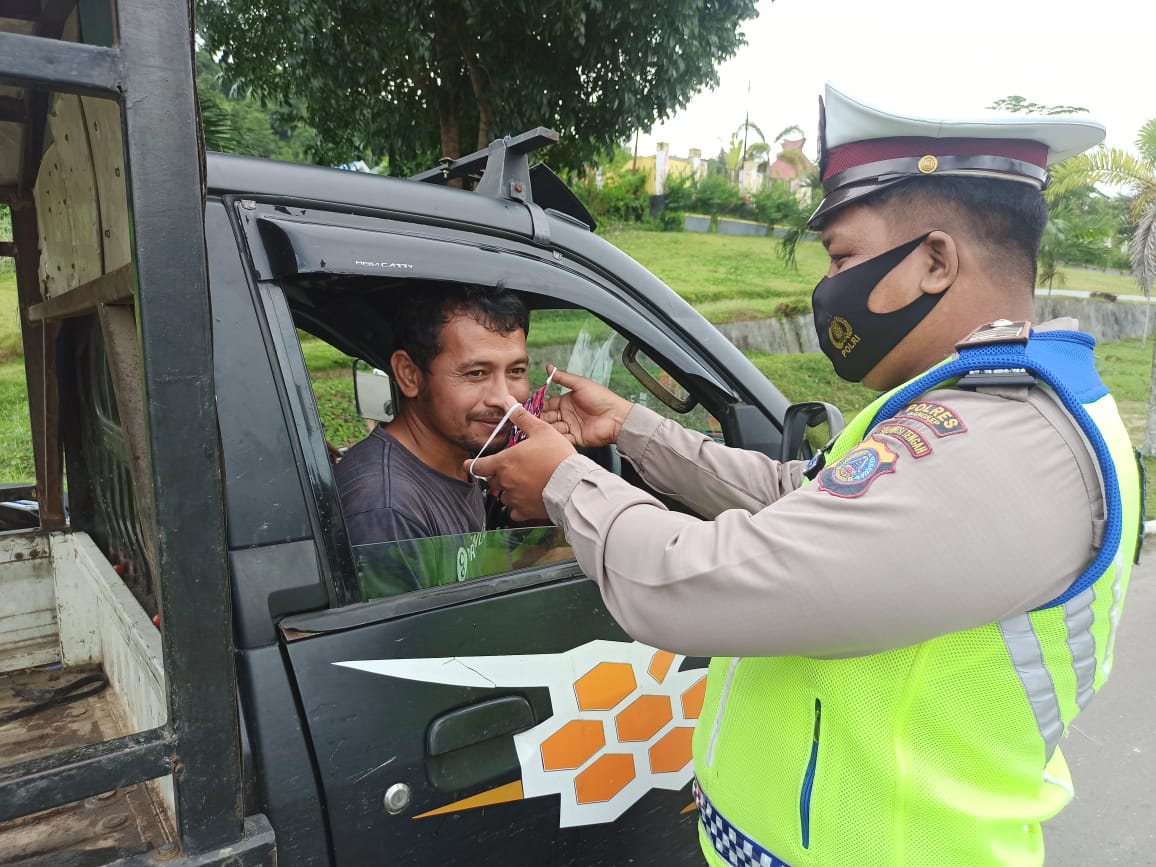 Regu Piket Sat Lantas Polres Bangkep sekaligus juga memberi himbauan prokes dan vaksinasi covid-19 kepada warga pengguna jalan yang melintas di jalan umum guna mencegah menyebar atau melonjaknya virus covid-19 .