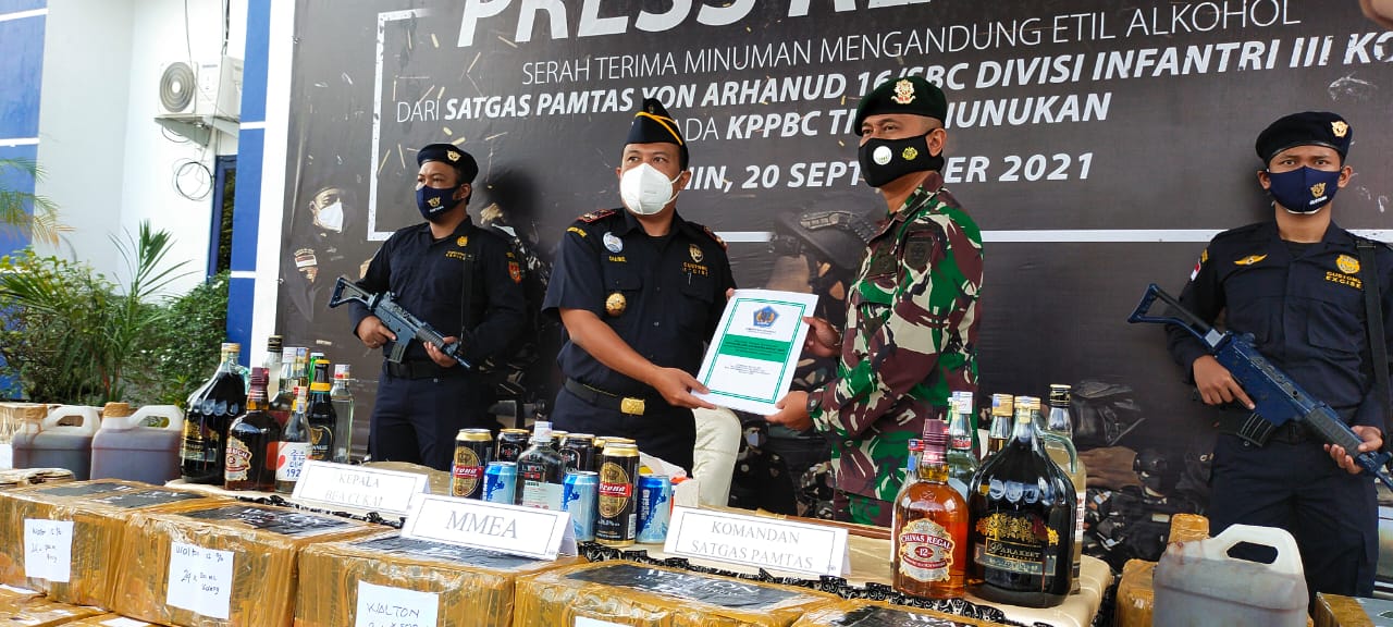MediaSuaraMabes, Nunukan – Satuan Tugas Pengaman Perbatasan (Satgas Pamtas) RI-Malaysia Yonarhanud 16/SBC/3 Kostrad, menyerahkan ribuan liter minuman keras (miras) ilegal kepada Kantor Pengawasan dan Pelayanan Bea dan Cukai (KPPBC) Tipe Madya Pabean C Nunukan, di Jalan Tien Soeharto Nunukan Timur Kabupaten Nunukan, Kalimantan Utara, Senin 20/09/2021.