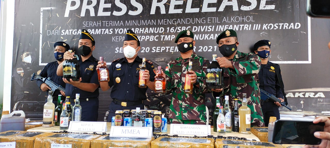 MediaSuaraMabes, Nunukan – Satuan Tugas Pengaman Perbatasan (Satgas Pamtas) RI-Malaysia Yonarhanud 16/SBC/3 Kostrad, menyerahkan ribuan liter minuman keras (miras) ilegal kepada Kantor Pengawasan dan Pelayanan Bea dan Cukai (KPPBC) Tipe Madya Pabean C Nunukan, di Jalan Tien Soeharto Nunukan Timur Kabupaten Nunukan, Kalimantan Utara, Senin 20/09/2021.