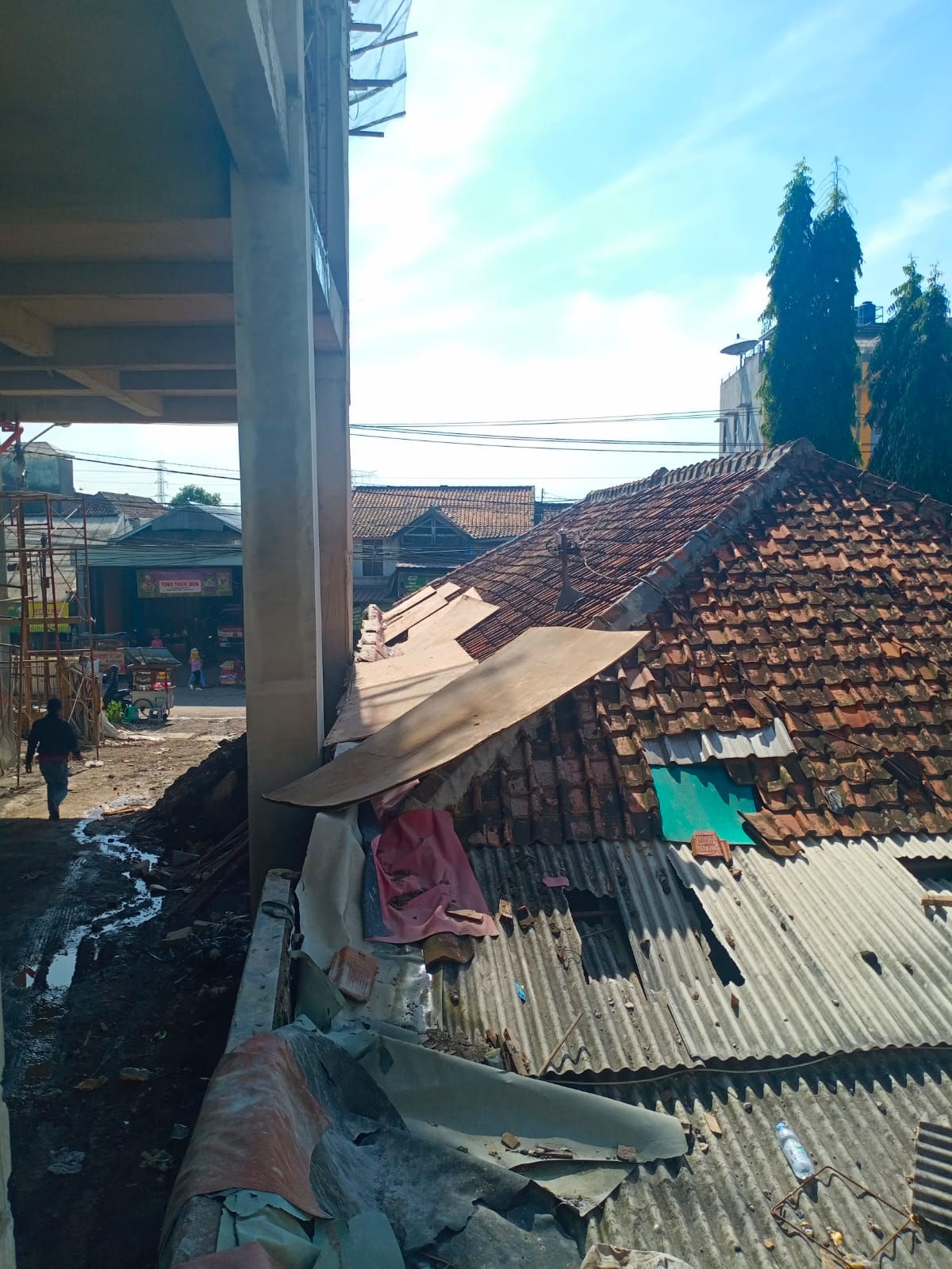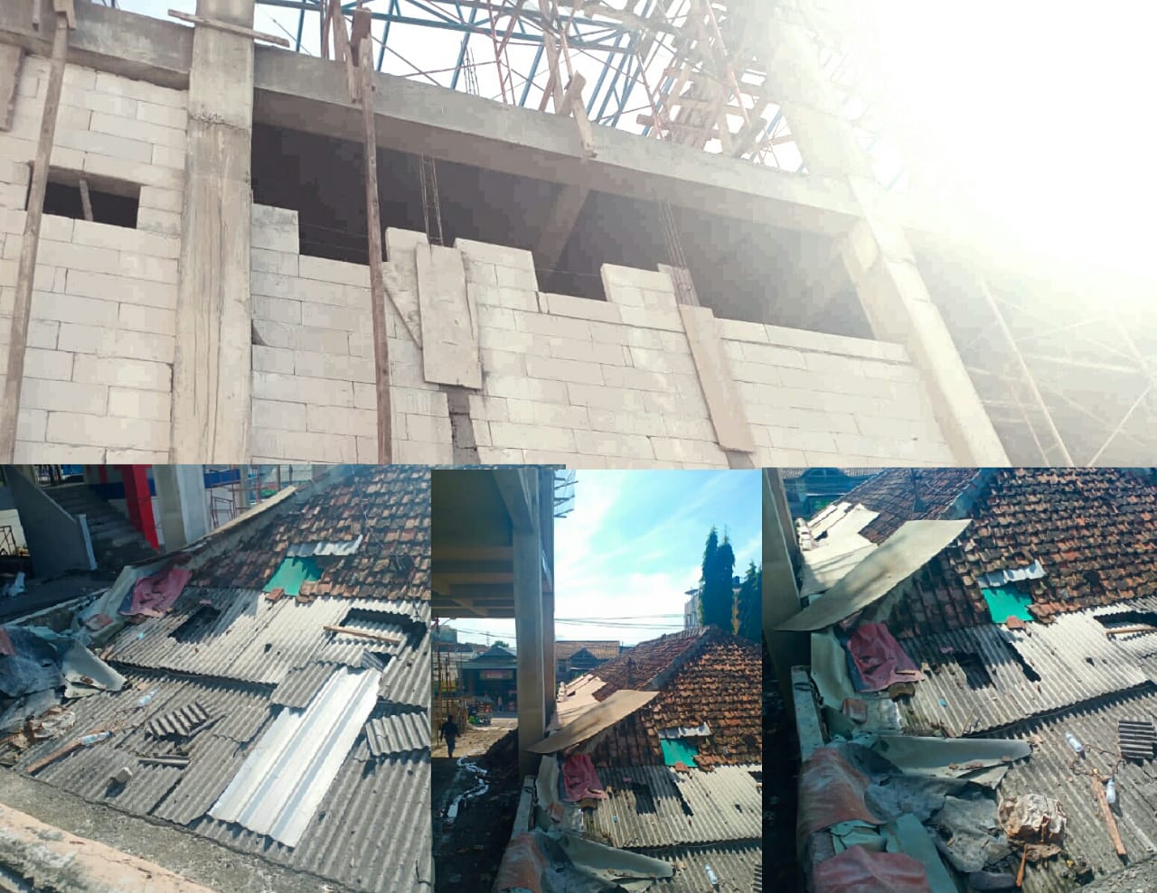 Salah satunya yang nampak adalah, tidak adanya jaring pengaman, sehingga mengakibatkan banyak material yang jatuh menimpa dan berceceran menimpa rumah milik H.Mamat yang berakibat kerugian bagi si pemilik rumah.