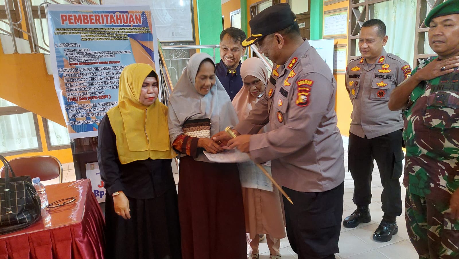 Media Suara Mabes, Kampar – Kapolres Kampar, AKBP. Didik Priyo Sambodo, SIK salurkan bantuan langsung tunai penanganan dampak inflasi atas kenaikan harga bahan bakar minyak yang biasa disebut BLT-BBM kepada warga penerima manfaat, Selasa, (08/11/2022), bertempat di kantor Camat Bangkinang kota, kabupaten Kampar.