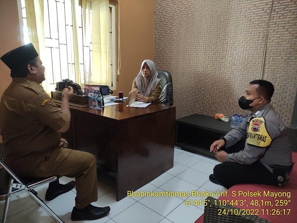 Bhabinkamtibmas Polsek Mayong mengatakan kegiatan sambang ke kantor desa dilakukan untuk bertatap muka dan mempererat silaturahmi dengan perangkat desa.