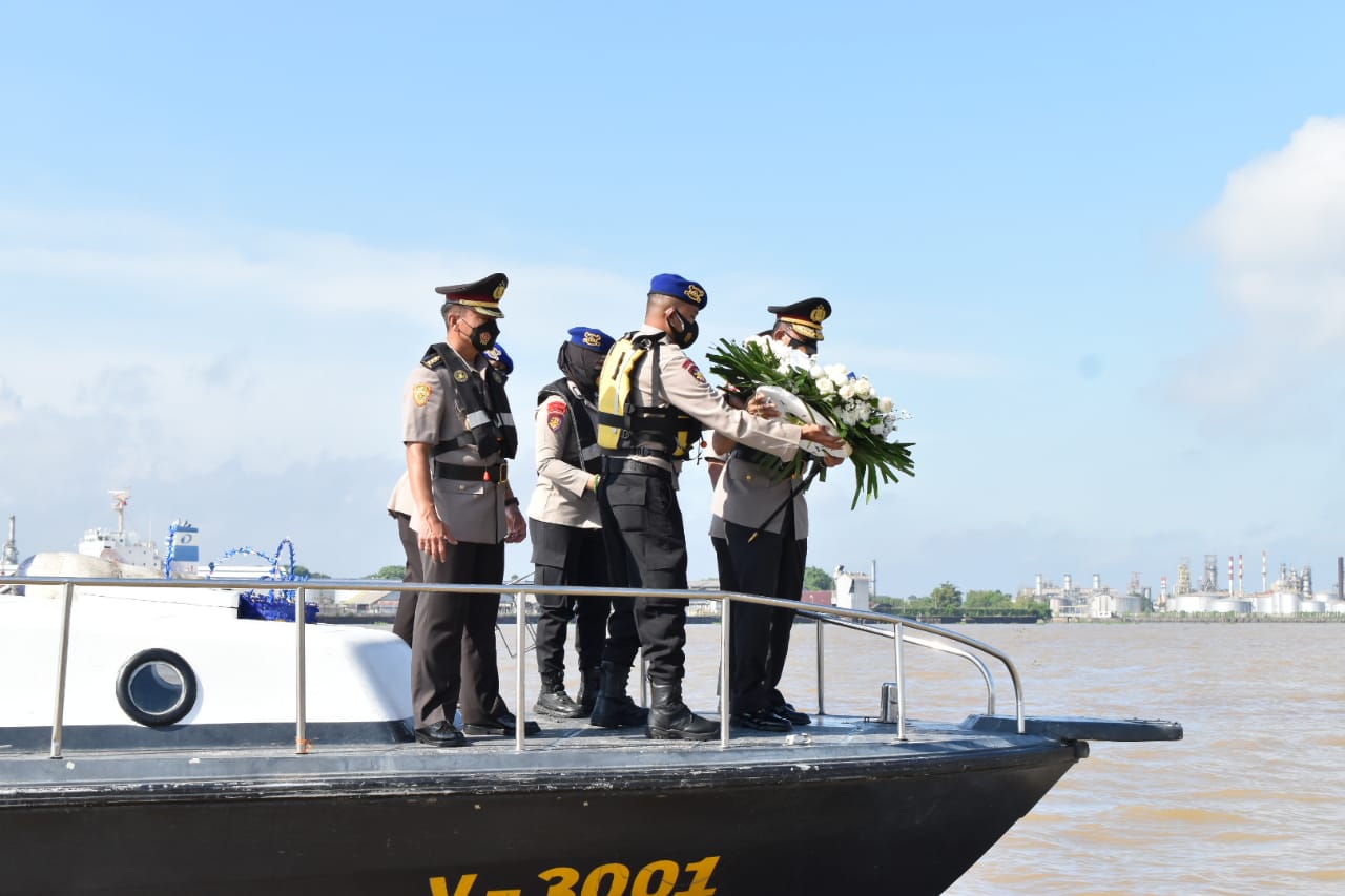 Turut hadir dalam ziarah tersebut, Wakapolda Sumsel Brigjen Pol Rudi Setiawan dan beberapa Pejabat Utama Polda Sumsel Dengan peserta perwakilan perwira, bintara, dan PNS Polda Sumsel acara dilanjutkan Tabur Bunga diperairan Sungai Musi Palembang