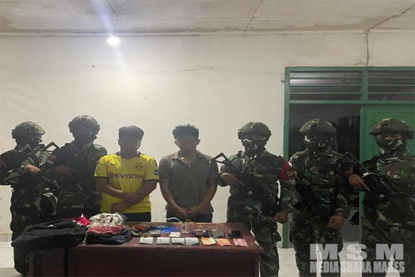 MediaSuaraMabes, Pontianak – Satgas Pamtas RI-Malaysia Batalyon Armed 16/Tumbak Kaputing mengamankan dua pemuda asal Malaysia yang kedapatan membawa Narkotika jenis sabu di jalan tikus Bukit Jagoi Indah, Desa Jagoi, Kecamatan Jagoi Babang, Kabupaten Bengkayang.