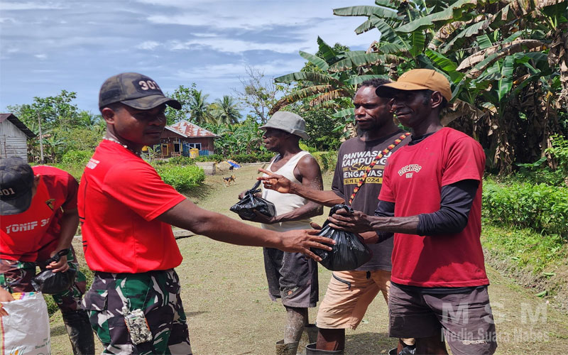 MediaSuaraMabes, Timika Papaua Tengah – Satgas Pam Obvitnas Yonif 301/PKS Pos Jitas Dalam rangka meningkatkan kepedulian masyarakat terhadap pentingnya kebersihan dan semangat gotong royong, menggelar kegiatan Karya Bakti bersama masyarakat serta pembagian sembako di Kampung Kanmapri, Distrik Jita, Kabupaten Timika, Provinsi Papua Tengah. Selasa (04/11/2025)