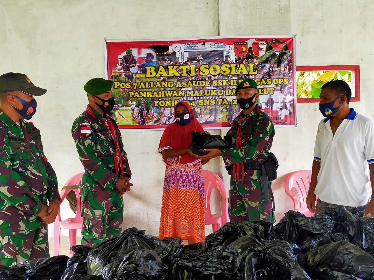 “kegiatan pembagian sembako ini merupakan upaya untuk meringankan beban masyarakat binaan pos Alang Saode, Sehingga kehadiran Satgas Yonif 734/Sns benar – benar dirasakan langsung oleh masyarakat” terang Dansatgas.
