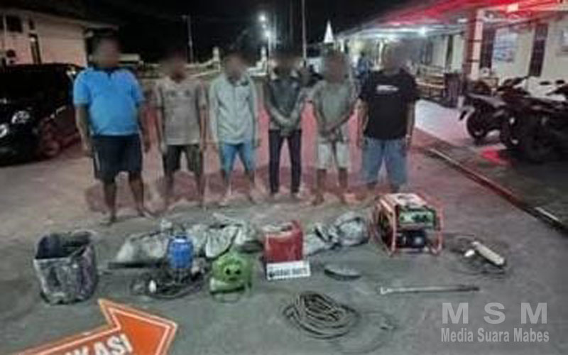 MediaSuaraMabes, Sambas – Satreskrim Polres Sambas berhasil mengamankan 9 terduga pelaku Pertambangan Emas Tanpa Izin (PETI) yang beroperasi di Divisi 6 PT WHS 2, Dusun Beruang, Desa Sebunga, Kecamatan Sajingan Besar, Kabupaten Sambas, Kalbar, Sabtu, 25 Januari 2025.