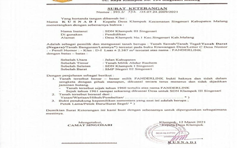 - SDN Klampok 1 Singasari dan SDN Klampok 3 Singasarijuga SMP negeri 2 Singasari Klampok kabupaten Malang berdasarkan Sertifikat Hak Pakai (SHP) - November 22, 2025