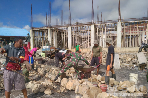 MediaSuaraMabes, Moanemani ~ Bertempat di kampung Ikebo distrik kamuu kab dogiyai, Babinsa koramil 1705-04/Moanemani Serda Asri melaksanakan karya bakti membantu warga membangun Pasar Paska kerusuhan Di Kab. Dogiyai