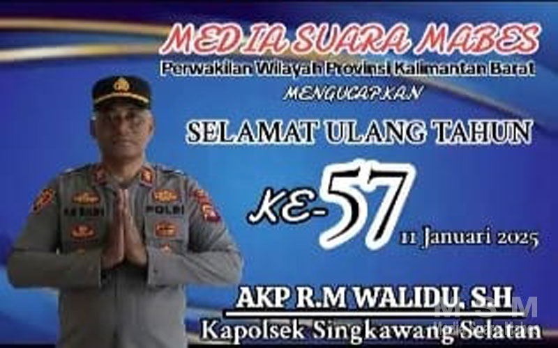 MediaSuaraMabes, Singkawang Kalbar – Keluarga Besar Media Suara Mabes (MSM) Provinsi Kalimantan Barat, mewakili Pimpinan Umum MSM Suratno, S.kom beserta Staf Redaksi Media Suara Mabes (MSM) Mengucapkan “Barakallah fii umrik, selamat ulang tahun kepada Kepala Kepolisian Sektor (Kapolsek) Singkawang Selatan AKP R.M Walidu, S.H. Sabtu, (11/1/2025)