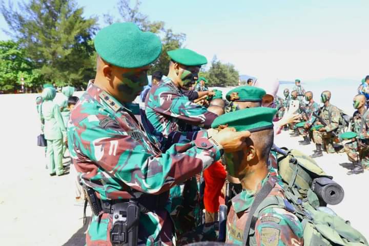 MediaSuaraMabes, Singkawang – Sebanyak 68 Tamtama Siswa mengikuti Upacara Tradisi Pembaretan Pendidikan Kejuruan Tamtama Infanteri Abituren Dikmata TNI AD Gel II Tahun Anggaran 2021 (OV) di Pantai Pak Lotay Pasir Panjang Kota Singkawang. (Kamis,7/7/2022)