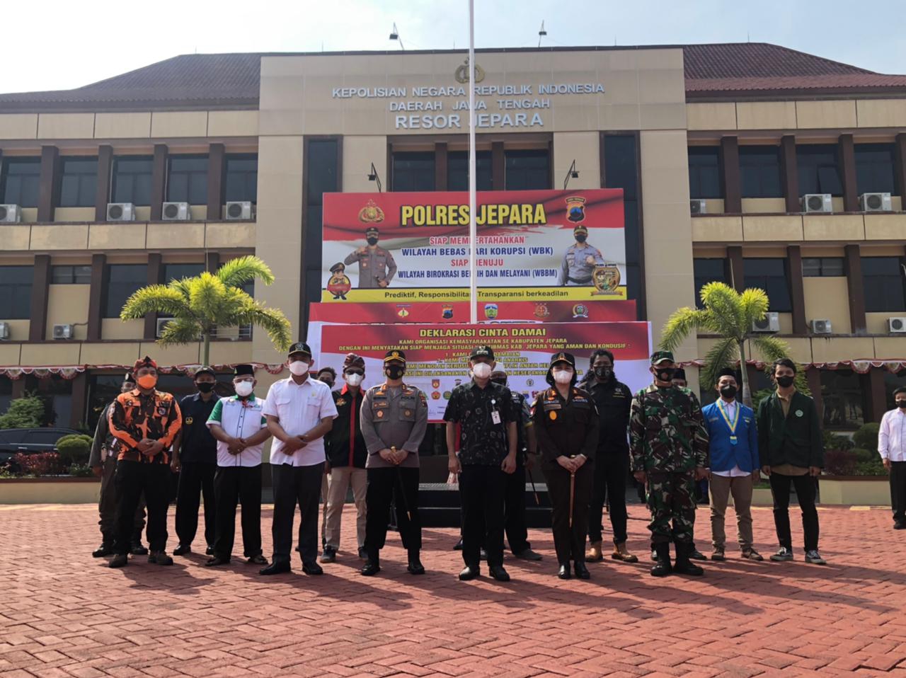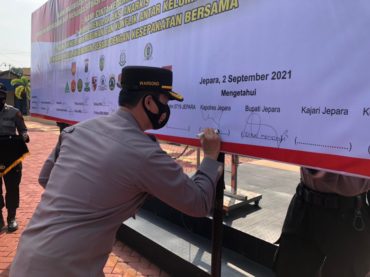 MediaSuaraMabes, Jepara — Pada Kamis, 02/09/2021 Apel bersama bertempat di Lapangan Endra Dharmalaksana Polres Jepara telah berlangsung penandatangan deklarasi cinta damai Ormas Se – kabupaten Jepara yang dipimpin oleh Buoati Jepara H.. Dian Kristiandi, S.Sos.