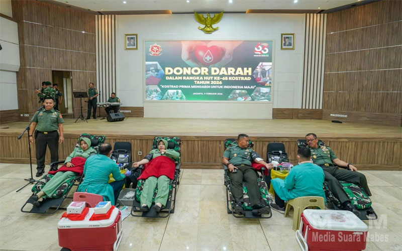 MediaSuaraMabes, Jakarta – Dalam rangka menyambut Hari Ulang Tahun (HUT) ke-65 Kostrad, Panglima Kostrad (Pangkostrad) Letjen TNI Mohammad Fadjar, M.P.ICT didampingi Ketua Persit Kartika Chandra Kirana Gabungan Kostrad, Ibu Ira Fadjar, dan Pejabat Utama Kostrad mengikuti kegiatan donor darah di Ruang Mandala, Markas Kostrad, Gambir, Jakarta Pusat, Senin (9/02/2026).