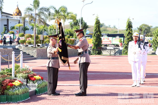 Berlangsung di halaman Apel Polda Sulawesi Tengah, Irjen Rudy Sufahriadi menyerahkan bendera simbol Polda Sulteng itu kepada penerusnya Irjen Agus Nugroho, Kamis (6/4/2023).